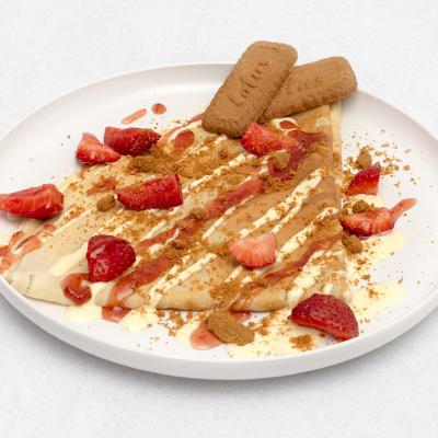 Biała czekolada, truskawki, krem lotus.