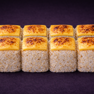 Ryż, nori, serek, ser żółty, surimi, ogórek, majonez japoński, sos teriyaki, sezam