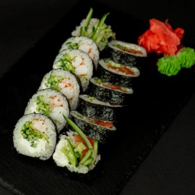 Nori, ryż, krewetka gotowana, serek philadelphia, sałata lodowa, ogórek, teriyaki, sezam