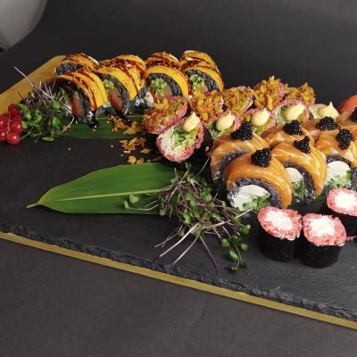 Philadelphia klasyczna x 8, Fusion chees roll x 8, Futomaki z tuńczykiem pieczonym x 10, Hosomaki yasashi x 4
