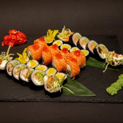 Philadelphia yasashi x 8, Futomaki Grill x 6, Futomaki z kurczakiem x 6, Hosomaki oshinko x 10