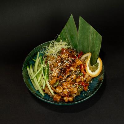 Ryz, tofu, papryka, pieczarki, marchewka, fasolka szparagowa, teriyaki, sezam, brokuły, sos czosnkowo - imbirowy, ogórek
