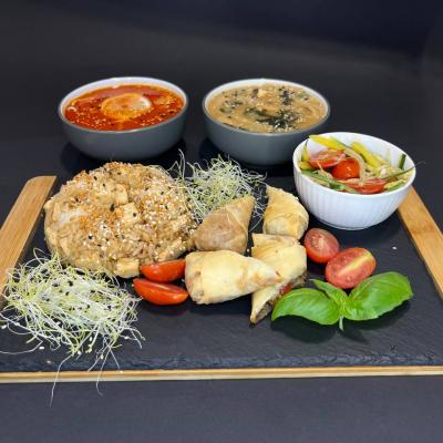 Zupa, sajgonki wege, ryż z Tofu, salatka