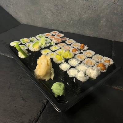 Maki z łososiem 6 szt., Maki z krewetką 6 szt., Maki z awokado 6 szt., Maki z mixem krabowym 6 szt., Maki z ogórkiem 6 szt., Maki z takwą 6 szt., Maki z phili 6 szt.