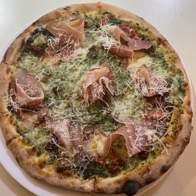 Pizza z pesto bazyliowym, pomidor, pomidory suszone, świeżą mozzarellę fior di latte, dojrzewająca szynka Speck, parmezan